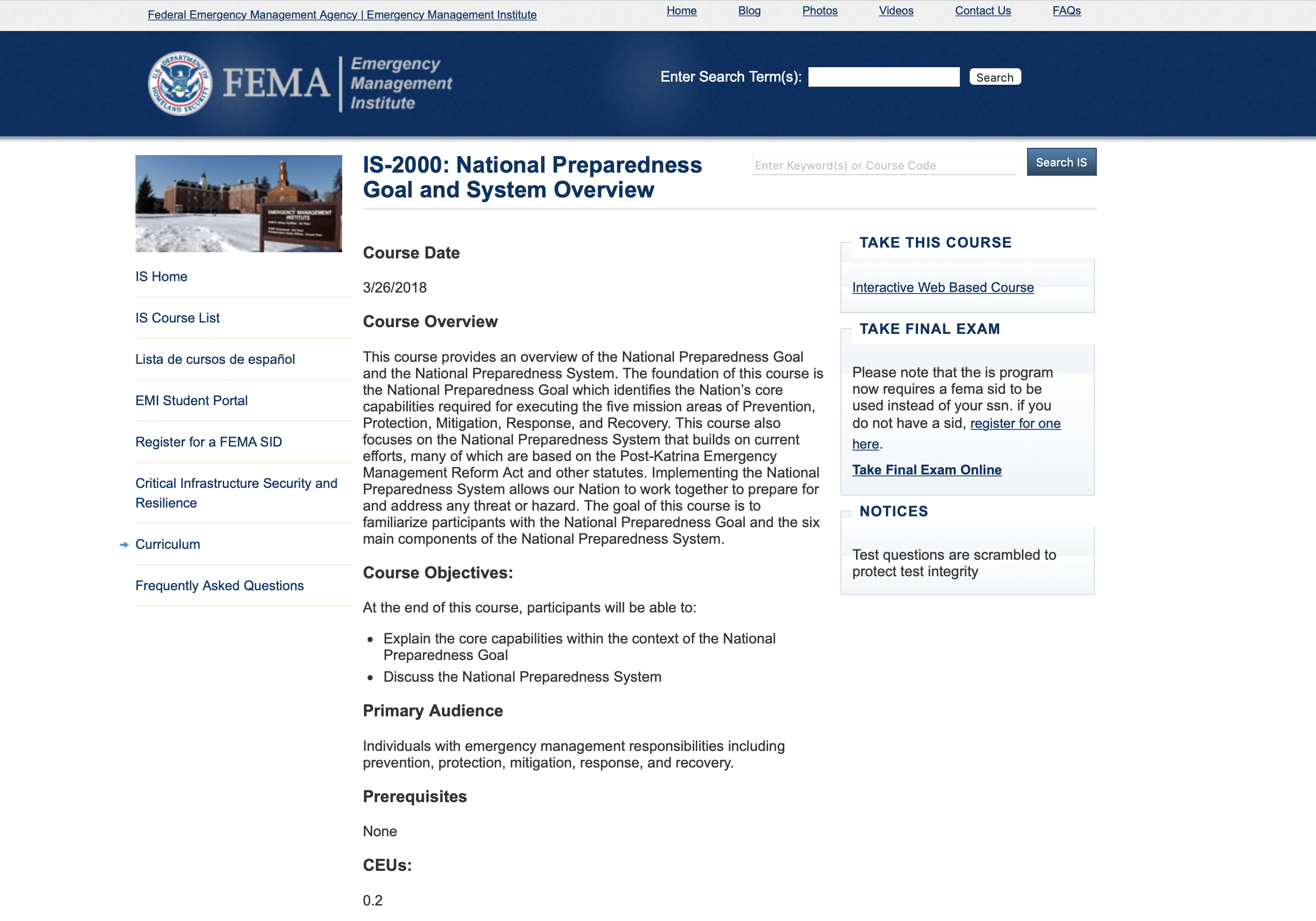 Screenshot of a free online course offering from FEMA’s Emergency Management Institute.