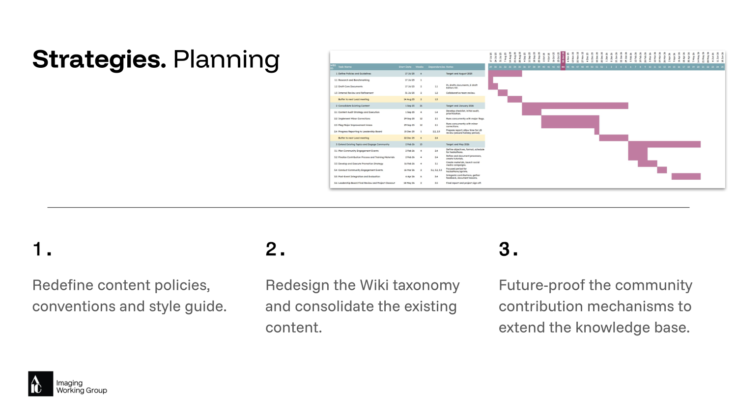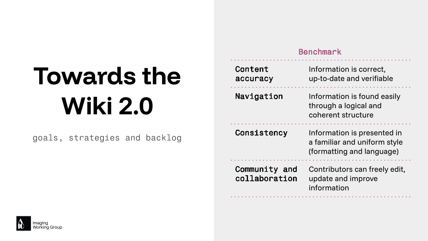 By summer 2027, all the contents and media of the topic groups will be reviewed, the taxonomy of the Imaging Wiki restructured, and the contribution processes redesigned to ensure high content accuracy, easy navigation, accessibility, and engagement from the community.