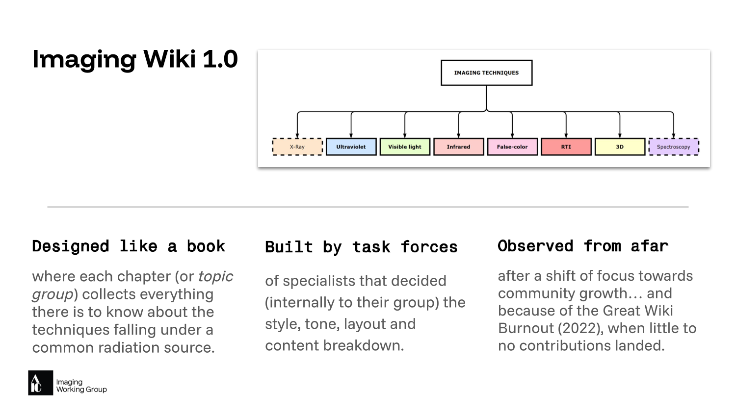 The way the Imaging Wiki was initially designed followed a linear structure, pretty much like a book with chapters. The Wiki was put together by topic groups, or task forces of professionals knowledgeable in one or more techniques, with one or more topic group Leads to manage and oversee the progress. Each page contained everything there's to know about the techniques under a common criterion (the main radiation source). Each group managed and developed the respective contents according to their needs.