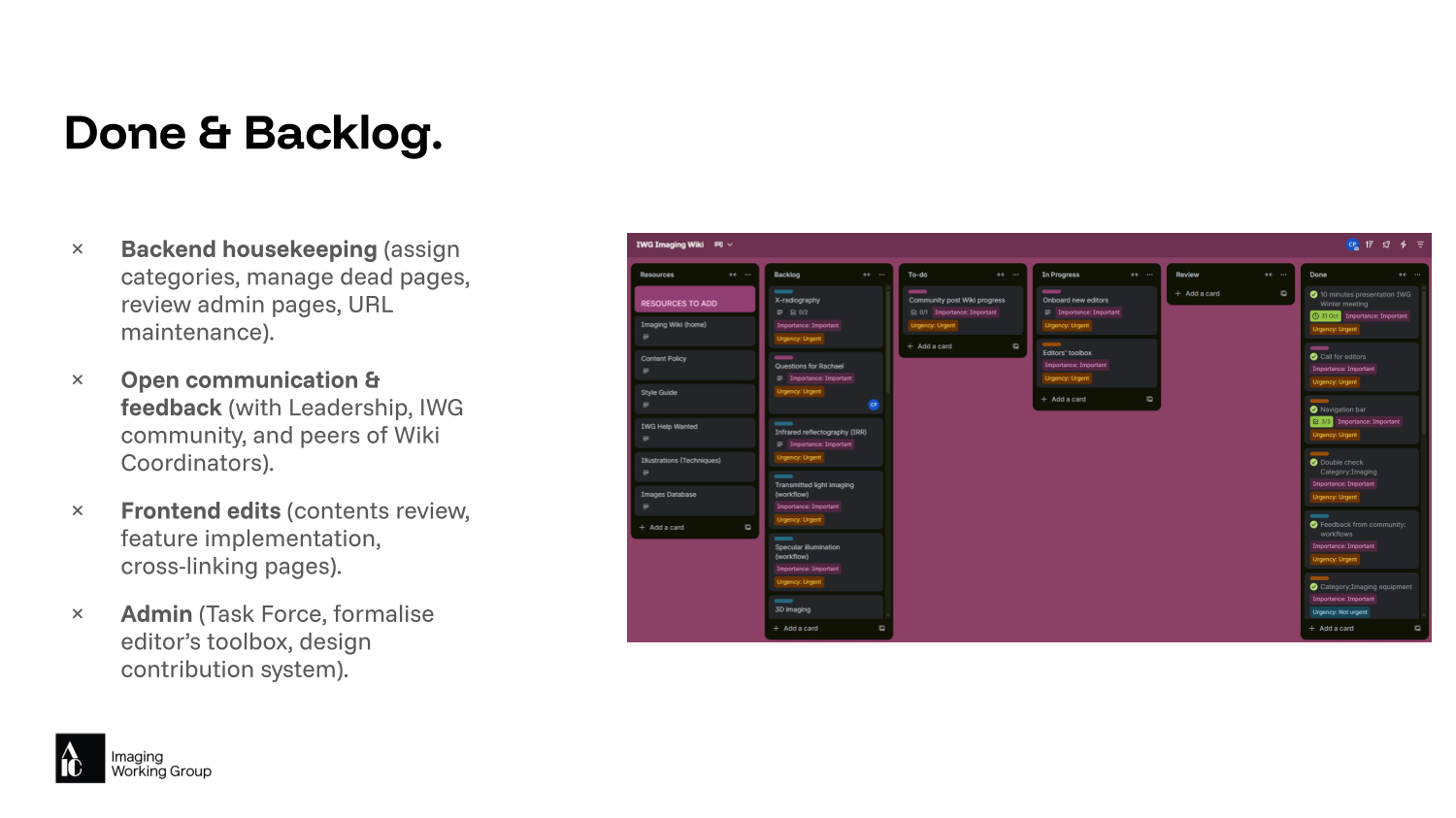 The backend housekeeping always brings surprises (like forgotten articles and broken links), and an open communication is kept open with all the parties involved (IWG leadership, the community, and the Wiki coordinators from the other specialty groups) to raise discussions on relevant topics, bugs and procedures.