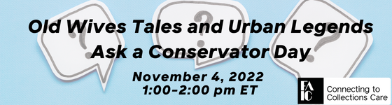 • 1.  C2C Care Old Wives Tales and Urban Legends Ask a Conservator Day Webinar November 4, 2022 1pm ET