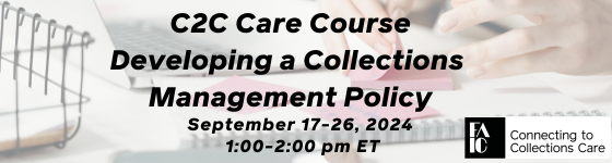 Writing a Collections Management Policy for the first time can be overwhelming due to the complexities of constantly changing legal and ethical requirements. Utilizing multiple teaching tools, including readings, podcasts, videos, and discussions, this 4 session course will guide participants through the development process of their policy. At the end of the program, participants should feel confident to edit an existing policy or write a new one with a focus on those collections-related law and ethics that impact our ability to care for, use, and manage collections.