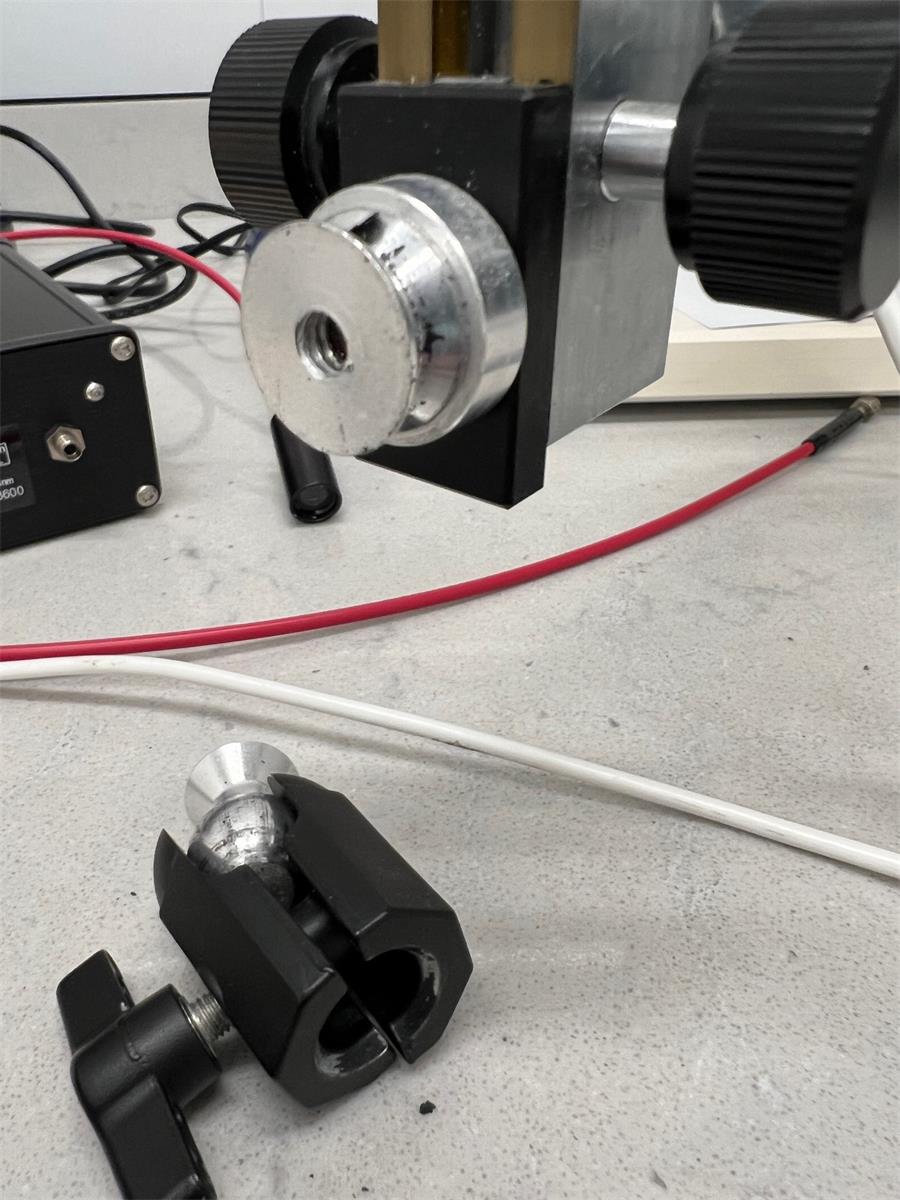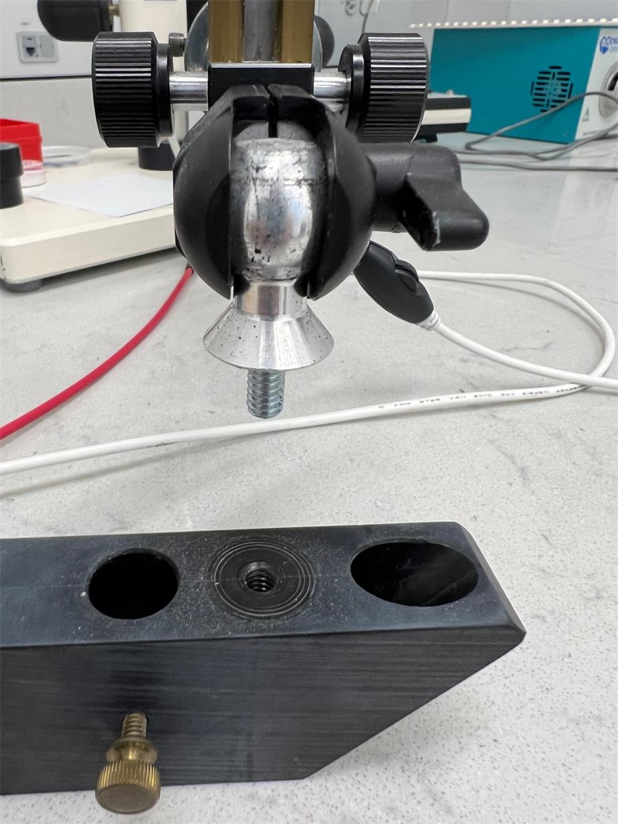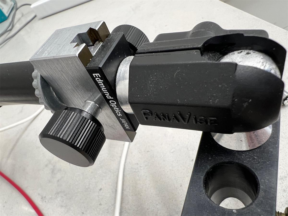 How did you attach the MFT fiber probe head to the boomstand dual arm? Some type of gimbal mount? We cut and drilled out a piece of aluminum "U" channel. There are two hex nuts on one side that attach to the tester head and one that attaches to the Edmund optics single axis adjuster. The Edmund optics single axis adjuster is attached to a piece of aluminum "L" channel that we cut a drilled out to attach to the end of the microscope stand using its existing holes for mounting a microscope. See image.