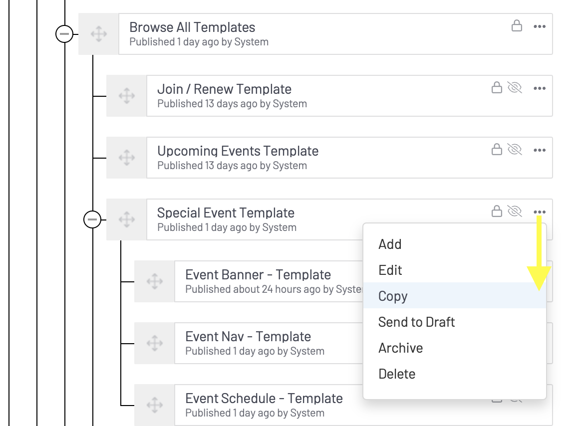 Be sure to leave Include all children for copy of "Special Event Template"? selected to copy the subpages as well: