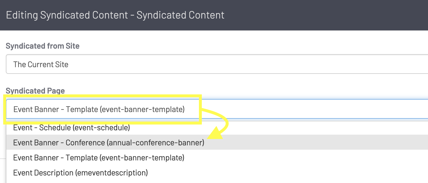 It's especially important that the Event Banner and Event Nav page titles have clear and unique names  so you can find them when swapping out the default template content in Syndicated Content widgets:
