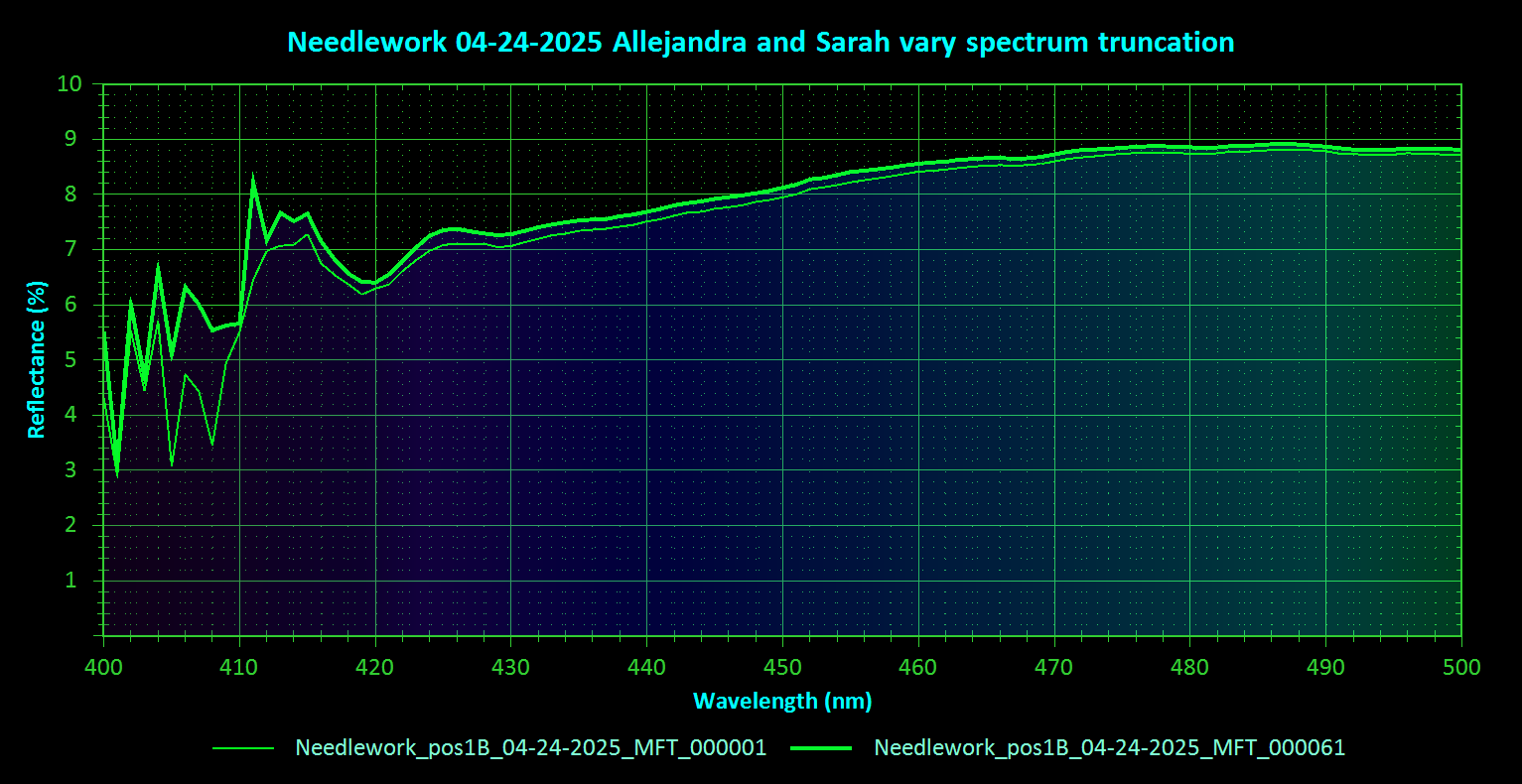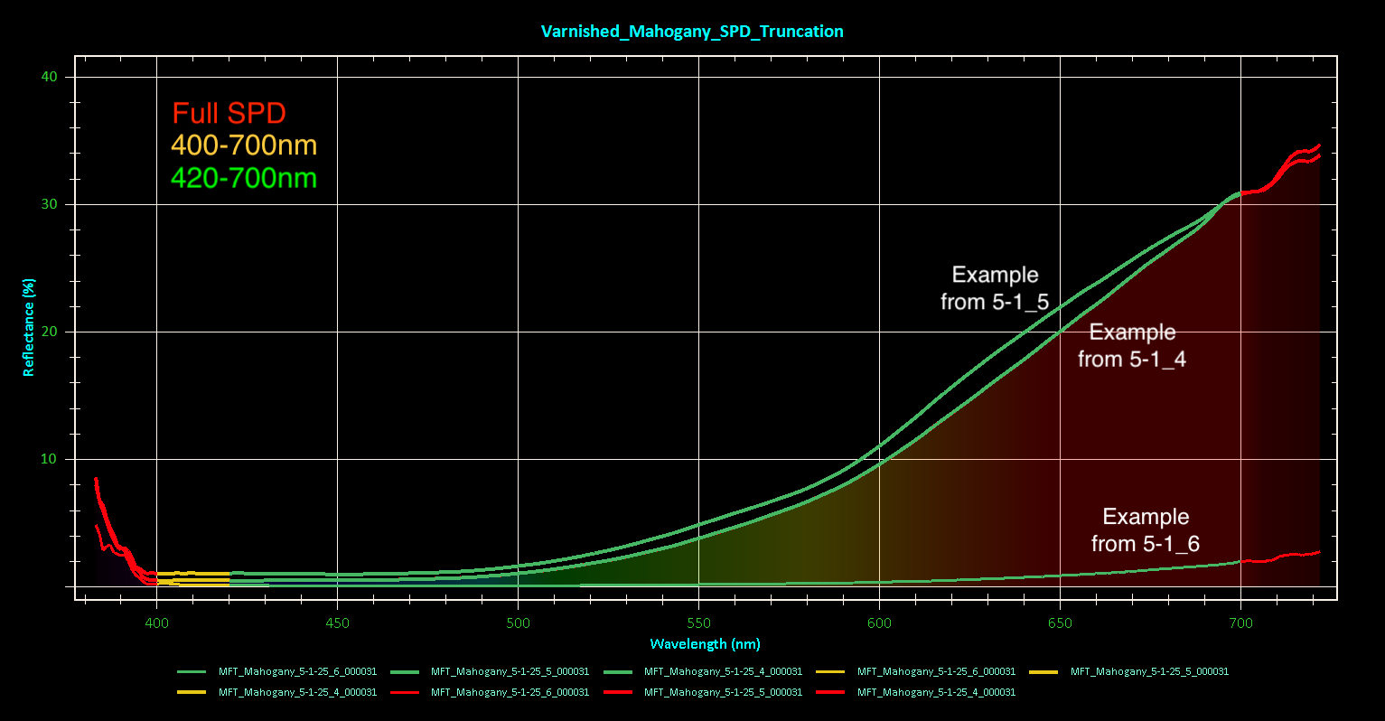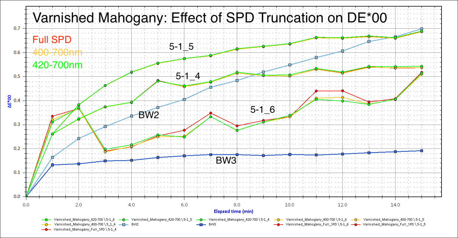The SPD truncation you all suggested appears to make the greatest difference with the lowest %R varnished sample run (5-1_6), though not as much as what Mike’s DE*00 graph showed. Perhaps that is simply a result of fewer sampling intervals over a shorter runtime on my end.
